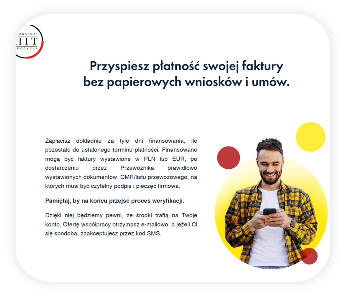 Finansowanie faktury dla przewoźników HiT Transport to usługa polegająca na ekspresowej wypłacie środków za fakturę , którą przewoźnik zgłosi do Partnera - PragmaGO. Usługa dostępna jest dla przewoźnika całkowicie online - nie musi on wypełniać papierowych wniosków i podpisywać papierowych umów - wystarczy, że samodzielnie wypełni wniosek online dostępny na stronie HiT Transport.